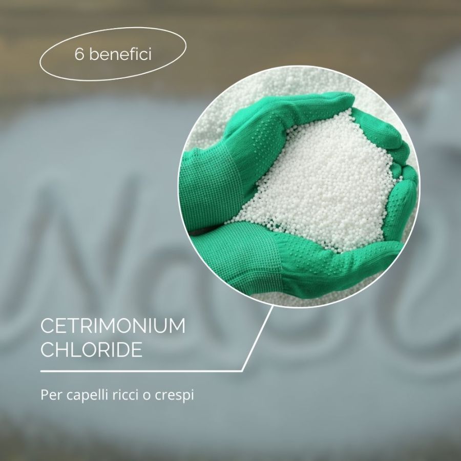 Cetrimonium chloride (cetil ammonio cloruro) è un ingrediente comune nei prodotti per capelli, in particolare quelli per capelli ricci o crespi, che offre diversi benefici:
