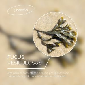 Il Fucus vesiculosus è ricco di vitamine, minerali e aminoacidi. Questi possono aiutare a nutrire il fusto del capello e il cuoio capelluto, favorendone potenzialmente la salute.